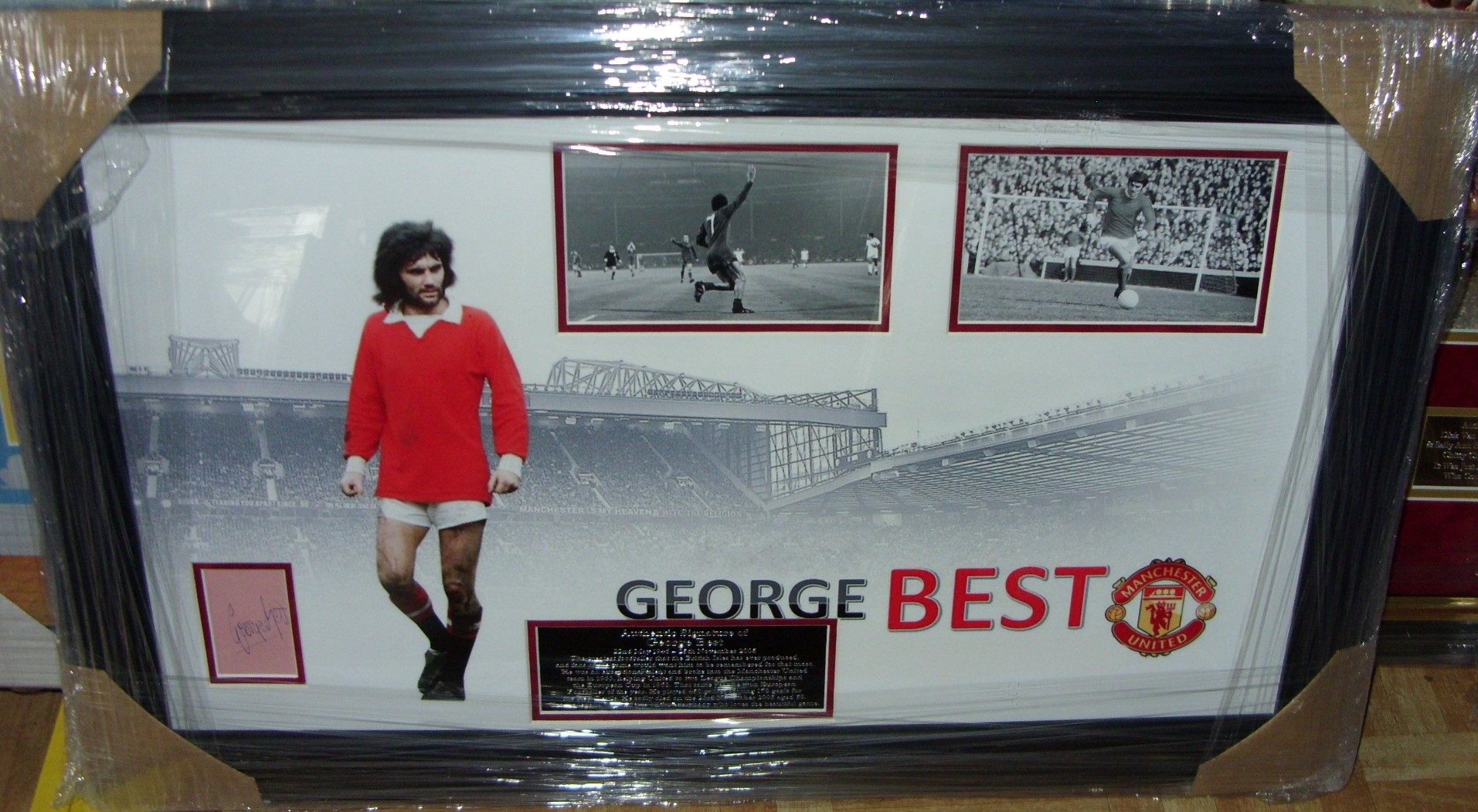 GEORGE BEST MANCHESTER UNITED LEGEND SIGNED MONTAGE Stunning 17" X 28" image display that features two 6" x 3" black and white photos cut into image along with original autograph book page signed the late great George Best personally collected . Mounted in red velvet with Italian black frame and engraved plaque.The greatest footballer that the British Isles has ever produced, and fans of the game would want him to be remembered for that most. He was an exceptional talent and broke into the Manchester United team in 1963,helping United to two League Championships and the European Cup in 1968. That same year he won European Footballer of the year.He played 450 games scoring 178 goals for the Red Devils. He sadly died on the 23rd November 2005 aged 59. Yet the legend will still live on for everybody who loves the beautiful game. I have been collecting for over 40 years and this is from my personal collection, but during this time have been buying and selling celebrity, sport, music, film and television memorabilia. All my autographs have been hand-signed by the stated person. I don't sell printed, secretarial or any other kind of fake autographs. Every autographed purchased is guaranteed on grounds of authenticity and will be issued with a COA, and my contact details. I collect stock myself or through a number trusted contacts who i have been dealing with over many years. AFTAL Dealer AD#141.