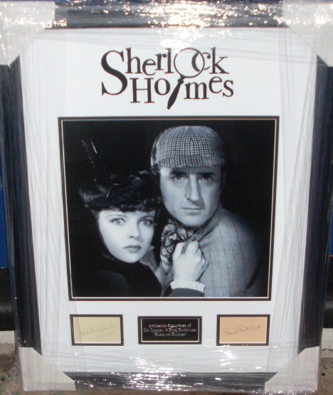 A 27" x 21" signed montage with a 12" x 14" black and white photo and the very rare & highly prized authentic original vintage signatures of Basil Rathbone and Ida Lapino. This is from a large personal collection owned by Ms Syble Rolk who worked in the wardrobe dept of 20th century-fox from 1947 until the late 1960's. Mounted in black and white along with header and engraved plaque in Italian black frame. They were famous for there roles as Sherlock Holmes and Ann Brandon in the 1939 epic The Adventures of Sherlock Holmes. I have been collecting in person for over 40 years and have the expertise in buying and selling celebrity,sport, music, film and television autographs. All my autographs have been hand-signed by the stated person. I don't sell printed, secretarial or any other kind of fake autographs. Every autographed purchased is guaranteed on grounds of authenticity and will be issued with a COA, and my contact details. I collect stock myself or through a number trusted contacts who i have been dealing with over a number of years.