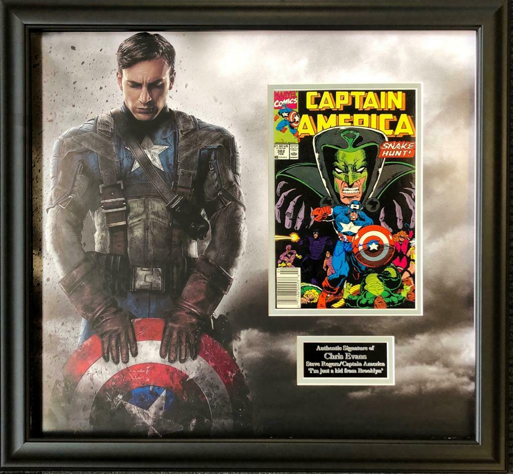 A ultimate Captain America montage consisting of a 22" X 18" picture mount with Captain America Comic Variant Edition 1 Midtown Signed by Captain America/Steve Rogers himself Chris Evans. Collected at Westfield London 2014 UK Premier of "Captain America" The Winter Solider. Mounted in ash black silverline frame and engraved plaque. Bid with confidence I am registered A.F.T.A. approved dealer #14I, owner of WDW Sporting Memorabilia and a recognised expert with over 50 years experience of collecting and dealing in celebrity signatures and memorabilia. All the autographs that I sell are obtained by me or acquired from known reliable sources. I have been collecting in person for over 50 years and have the expertise in buying and selling celebrity, sport, music, film and television autographs. All my autographs have been hand-signed by the stated person. I don't sell printed, secretarial or any other kind of fake autographs. Every autographed purchased is guaranteed on grounds of authenticity and will be issued with a COA, and my contact details. I collect stock myself or through a number trusted contacts who i have been dealing with over a number of years.