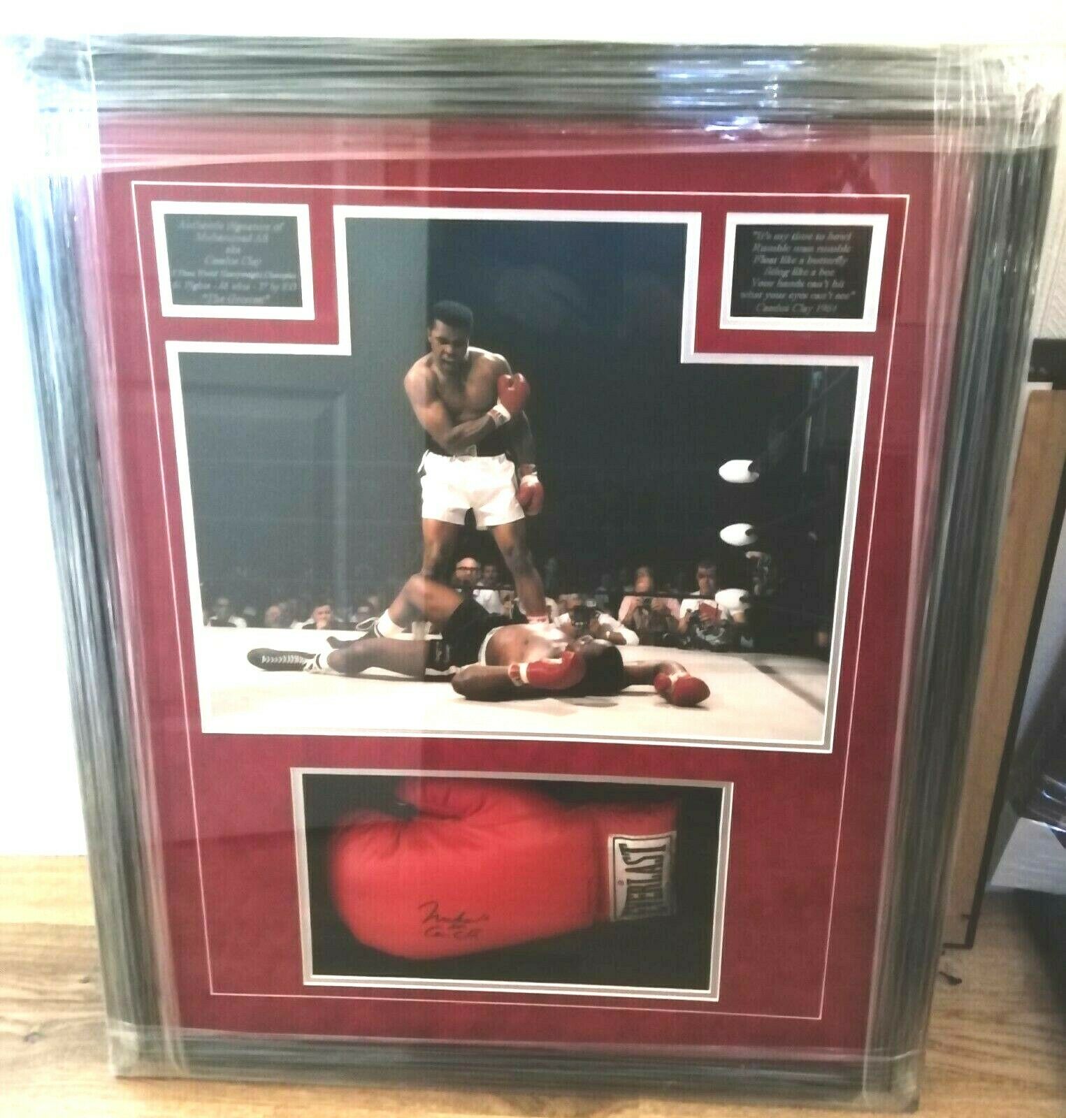 This 34"x 28" box framed montage with authentic full size Everlast Boxing Glove hand signed by Muhammad Ali in black sharpie pen . The greatest heavyweight boxer of all time. The glove was collected personally at his training camp at Territorial Army Gym in White City London in May 1966 and he endorsed the glove with aka Cassius Clay . Mounted in red velvet and gold with the iconic 20"x 16"colour photo of his KO of Sonny Liston and engraved plaques in a ash black box frame. He is regarded as one of the leading heavyweight boxers of the 20th century, and remains the only three-time llineall heavyweight champion. During 1964 he reigned as the undisputed heavyweight champion, his record of the most wins in heavyweight title bouts in modern boxing history at 22 was unbeaten for more than 35 years. He is the only boxer to be named Ring Magazine Fighter of the Year six times and was also ranked as the greatest athlete of the 20th century by Sports Illustrated, the Sports Personality of the Century by the BBC, and the third greatest athlete of the 20th century by ESPN Sports Century. Nicknamed "the Greatest", he was involved in several historic boxing matches. Notable among these were the first Liston fight; the "Fight of the Century", "Super Fight II" and the "Thrilla in Manila" against his rival Joe Frazier and "The Rumble in the Jungle" against George Foreman. Bid with confidence I am registered A.F.T.A. approved dealer #14I, with over 50 years experience of collecting and dealing in celebrity signatures and memorabilia. All the autographs that I sell are obtained by me or acquired from known reliable sources. I have been collecting in person for over 50 years and have the expertise in buying and selling celebrity, sport, music, film and television autographs. All my autographs have been hand-signed by the stated person. I don't sell printed, secretarial or any other kind of fake autographs. Every autographed purchased is guaranteed on grounds of authenticity and will be issued with a COA, and my contact details. I collect stock myself or through a number trusted contacts who i have been dealing with over a number of years.