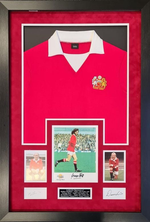 A fantastic signed 43"x 31" display with replica vintage Manchester United Shirt along with the original signatures of George Best on photo and Bobby Charlton Denis Law on card with photos, these are from my personal collection which I have collected over the years. Mounted in club colours in ash black frame. Holy Trinity refers to the trio of George Best, Bobby Charlton and Denis Law who helped United become the first ever English club team to win the European Cup in 1968. Bobby Charlton was a member of the Busby Babes, a group of talented young players brought through the club's academy by the eponymous manager Matt Busby and his assistant Jimmy Murphy, as well as club scout Joe Armstrong, who discovered Charlton in 1953 and Best in 1961, among others. Law arrived at the club from Italian team Torino for a club record £115,000 in 1962, having previously played for Huddersfield Town and rivals Manchester City. Bobby Charlton made his debut on 6th October 1956, scoring twice in a 4–2 win against Charlton Athletic. Denis Law made his debut on 18 August 1962, scoring in a 2–2 with West Bromwich Albion. Although George Best made his debut against West Bromwich Albion on 14th September 1963, it wouldn't be until the reverse fixture on 18th January 1964 when all three would feature in the same starting line-up; a 4–1 victory in which all three scored, with Law scoring two of them. Throughout the 1960s all three would be voted as the winners of the Ballon d'Or, the trophy awarded to the world's best player. Law won in 1964, Charlton in 1966 and Best in 1968. I have been collecting for over 40 years and during this time have been buying and selling celebrity, sport, music, film and television memorabilia. All my autographs have been hand-signed by the stated person. I don't sell printed, secretarial or any other kind of fake autographs.Every autographed purchased is guaranteed on grounds of authenticity and will be issued with a COA, and my contact details.