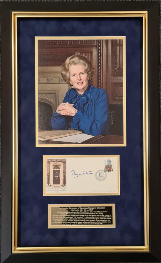 A stunning 21" X 17" display that features a 9"x 7" colour vintage photo and a highly sort after signed first day cover marking the 250th anniversary of No.10 Downing Street and signed by Margaret Thatcher while in office. Each cover is numbered on the reverse as a worldwide limited edition of 96 copies this is 70 and from my personal collection. Mounted in blue velvet and gold in Italian black frame along with gold engraved plaque. She served as Prime Minister of the United Kingdom from 1979 to 1990 and Leader of the Conservative Party from 1975 to 1990. She was the longest-serving British prime minister of the 20th century and the first woman to hold that office. A Soviet journalist dubbed her the "Iron Lady", a nickname that became associated with her uncompromising politics and leadership style. As prime minister, she implemented policies that became known as Thatcherism. In 2013 she sadly passed away in London at the age of 87. I have been collecting in person for over 40 years and have the expertise in buying and selling celebrity,sport, music, film and television autographs. All my autographs have been hand-signed by the stated person. I don't sell printed, secretarial or any other kind of fake autograph. Every autographed purchased is guaranteed on grounds of authenticity and will be issued with a COA, and my contact details. I collect stock myself or through a number trusted contacts who i have been dealing with over a number of years.