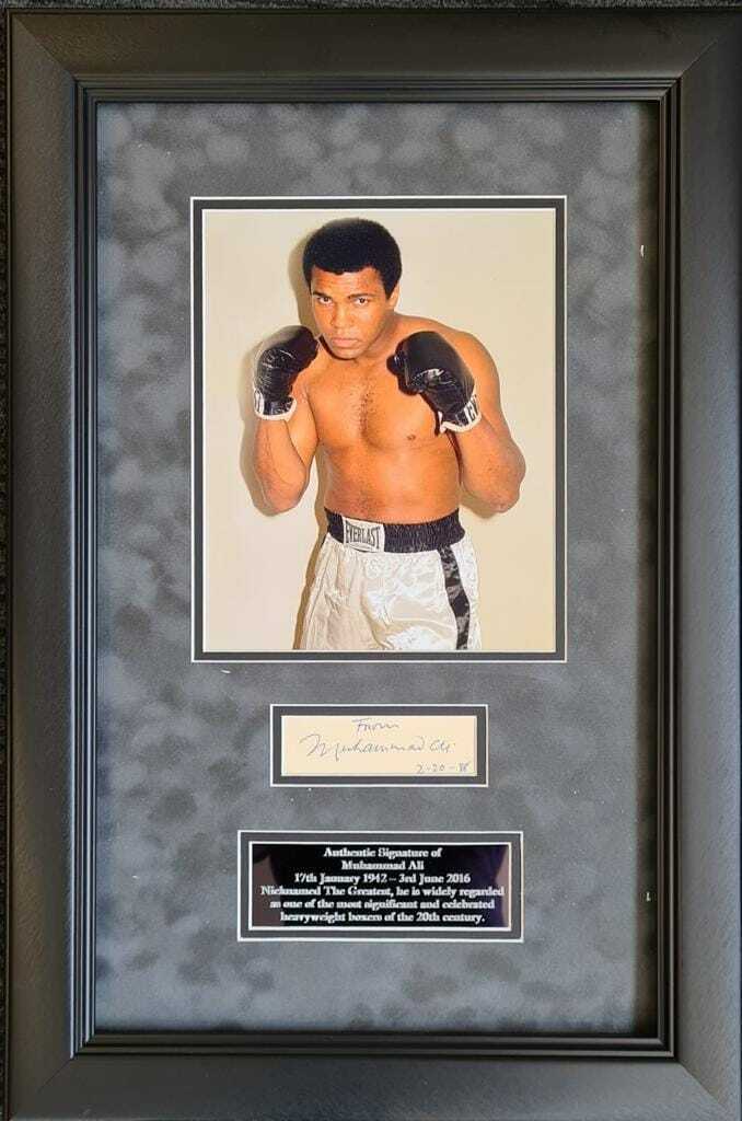 A fantastic 25"x16" hand-signed photo display featuring the world champion in white shorts with accompanying black gloves. The signature is in blue pen and collected personally in 1988 on one of his visits to the UK. Mounted in blue velvet and silver with engraved plaque in Italian black frame. Nicknamed “The Greatest”, MuhammAd Ali was the first boxer to win three-time world heavyweight championship. Winning his first title in 1964 against Sonny Liston, Ali was also an Olympic gold medallist in the 1960 summer Olympic game held in Rome, Italy. His bouts with legendary boxers over his career have gone down as iconic engagements in the history of boxing. His fight against Joe Frazier in 1971 billed the “Fight of the Century” and his rematch “The Thrilla in Manila” showed the grit and skill of Ali. I have been collecting in person for over 50 years and have the expertise in buying and selling celebrity, sport, music, film and television autographs. All my autographs have been hand-signed by the stated person. I don't sell printed, secretarial or any other kind of fake autographs. Every autographed purchased is guaranteed on grounds of authenticity and will be issued with a COA, and my contact details. I collect stock myself or through a number trusted contacts who i have been dealing with over a number of years.