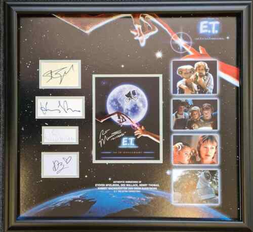 A Fantastic 29x 27" picture mount of ET Film along with the original signatures of Steven Spielberg, Drew Barrymore, Dee Wallace, Henry Thomas, Robert MacNaughton. Professionally framed with engraved plaque in Italian black frame. This is a great collectable item for any film buff, E.T. the Extra-Terrestrial is a 1982 American science fiction fantasy film co-produced and directed by Steven Spielberg and written by Melissa Mathison, featuring special effects by Carlo Rambaldi and Dennis Muren, and starring Henry Thomas, Dee Wallace,Robert MacNaughton, Drew Barrymore, Peter Coyote and Pat Welsh as the voice of the title character. It tells the story of Elliott (Thomas), a lonely boy who befriends an extraterrestrial, dubbed "E.T." (Welsh), who is stranded on Earth. He and his siblings help it return home while attempting to keep it hidden from their mother and the government. I have been collecting in person for over 40 years and have the expertise in buying and selling celebrity,sport, music, film and television autographs. All my autographs have been hand-signed by the stated person. I don't sell printed, secretarial or any other kind of fake autographs Every autographed purchased is guaranteed on grounds of authenticity and will be issued with a COA, and my contact details. I collect stock myself or through a number trusted contacts who i have been dealing with over a number of years.