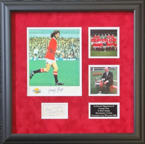 A fantastic piece of football history a signed photo by George Best along with the signature of Matt Busby. Mounted in red velvet and with engraved plaque in black frame. From my personal collection I don't sell printed, secretarial or any other kind of fake autographs. Every autographed purchased is guaranteed on grounds of authenticity and will be issued with a COA, and my contact detail I collect stock myself or through a number trusted contacts who i have been dealing with over a number of years.